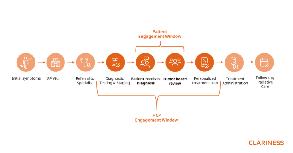 The illustration above shows the oncology patient journey from diagnosis to treatment, highlighting patient and HCP engagement windows. © Clariness